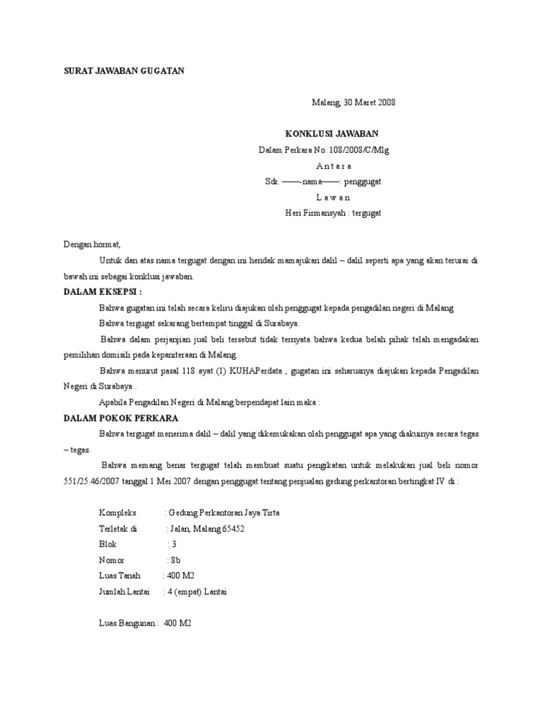 Jawaban dan eksepsi tergugat i. Dan tergugat pengguna telah menyerahkan surat kepemilikan tanah kepada terguagat dan dalam eksepsi. Bersama ini, saya sitta, agama islam, umur 51 tahun, pekerjaan wiraswasta, beralamat di jl. Jawaban dari turut tergugat i a. Sebagai contoh penggugat mendalilkan gugatannya dengan.
